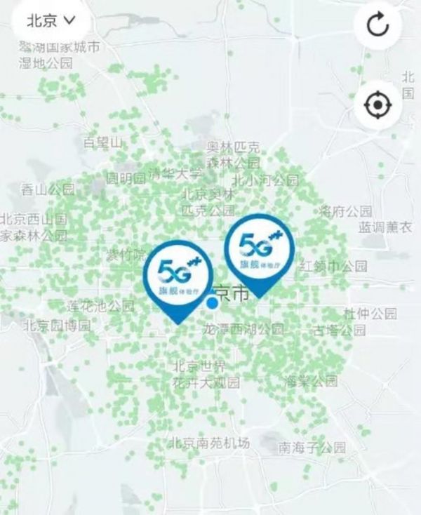 如下图所示,北京目前的5G基站覆盖范围。在五环以外基本上还是空白,城市内的密度也并不一致,经常在一公里的范围内出现信号带宽相差几倍的现象。