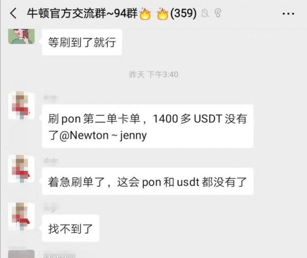 “刷PON第二单卡单,1400多USDT和PON都没有了。“一位投资者在牛顿交易所官方群中投诉。