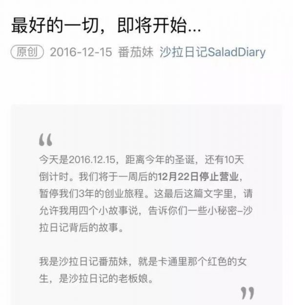 2016年12月,创立三年,日订单稳定的“沙拉日记”在公众号文章中宣布停业。从某种层面来看,沙拉日记是整个轻食行业的现实代表,用一句话可以概括“起于理想,长于风口,死于强盛。”