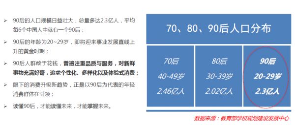 根据教育部学校规划建设发展中心的数据,我国90后总量多达2.3亿人,这就意味着平均每6个中国人中就有一个90后;同时,90后的年龄为20~29岁,即将迎来事业发展直线上升的黄金时期;而他们敢于花钱,普遍注重品质与服务,对新鲜事物充满好奇,追求个性化、多样化以及体验式消费的诸多特征,也是当前消费升级的内核所在。