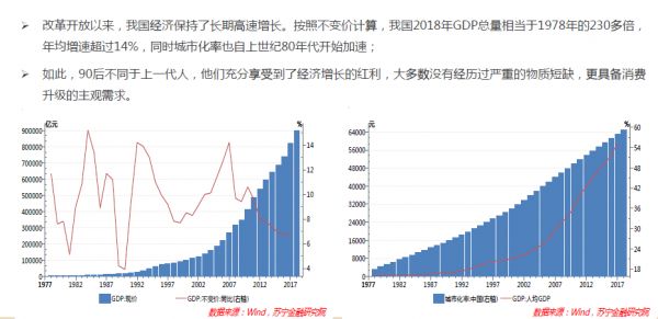 众所周知,改革开放以来,我国经济保持了长期高速增长。按照不变价计算,我国2018年GDP总量相当于1978年的230多倍,年均增速超过14%,同时城市化率也自上世纪80年代开始加速。90后刚好于这一时期出生,他们充分享受到了经济增长的红利,大多数没有经历过严重的物质短缺,更具备消费升级的主观需求。