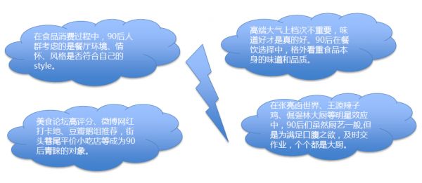 90后较少受广告宣传的影响,对口味、环境、服务等都有自己的独到偏好,并且乐于传播口碑,分享自己的体验感受。此外,由于经济实力有限,他们不会经常出入高档酒店,反倒是有特色有卖点的中低端餐馆更能吸引他们。