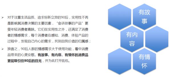 换言之,90后人群的情感需求大于使用功能,看中消费品带来的心灵安慰。有故事、有内容、有情怀的消费品更能吸引住90后的目光,并为此打开钱包。