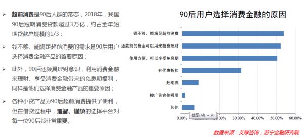 超前消费是90后人群的常态,2018年,我国90后短期消费贷款超过3万亿,约占全年短期贷款总规模的1/3,而钱不够、能满足超前消费的需求是90后用户选择消费金融产品的首要原因。