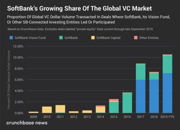 到目前为止,软银在2019年的风险投资交易额占全球的十分之一,其中包括软银、愿景基金及其相关投资实体的投资交易。