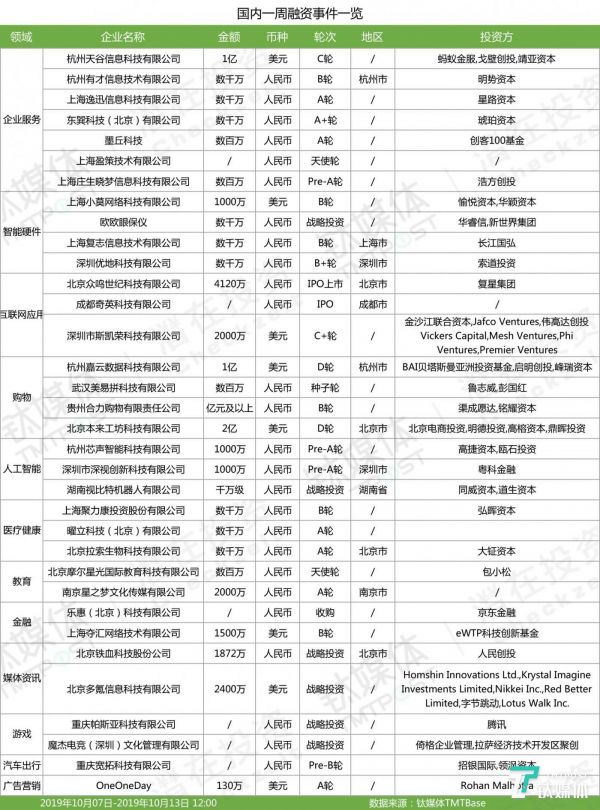 ✔. 本周钛媒体Pro全球创投数据库TMTBase总计收录国内投融资事件有36起。