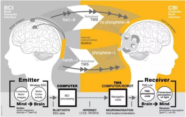 BTBI涉及诱导两个不同的大脑直接相互通信。BTBI系统最初使用非侵入性记录和脑刺激进行实验,如图2所示。