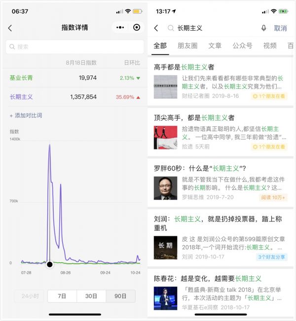 我进入微信指数一倒腾发现。“长期主义”的微信指数远远高过“基业长青”。今年8月数据峰值一度是“长期主义”的百倍以上。