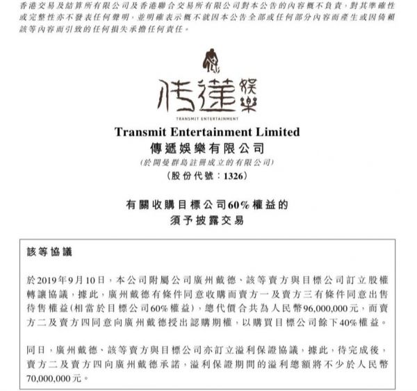 9月10日,港股上市公司传递娱乐发布公告称,旗下广州戴德将以9600万元收购闻澜文化60%股权;按此估算,偶像经纪公司闻澜文化估值将超过1.6亿元。