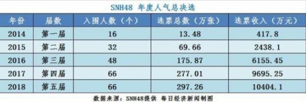 国内也不乏学习日本打法的偶像产品,其中相对成熟的有SNH48。从2014年开始到2018年,SNH48总决选投票收入从417.8万元增长至 1.04亿元。
