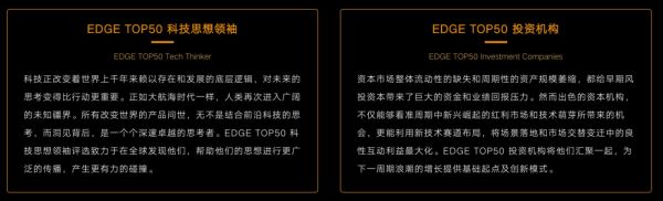 EDGE TOP50 是T-EDGE作为全球创新平台的前沿价值榜单,始终以T-EDGE前沿眼光发掘全球范围内的创新力量。今年更是聚焦具有TECH THINK的科技个人与机构,他们是真正思考科技边界的前沿领袖,是突破精神与创新能力的持续发掘者。未来,T-EDGE还将和他们一起,触摸前沿感受未来。