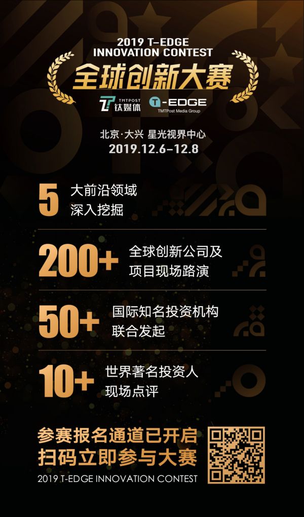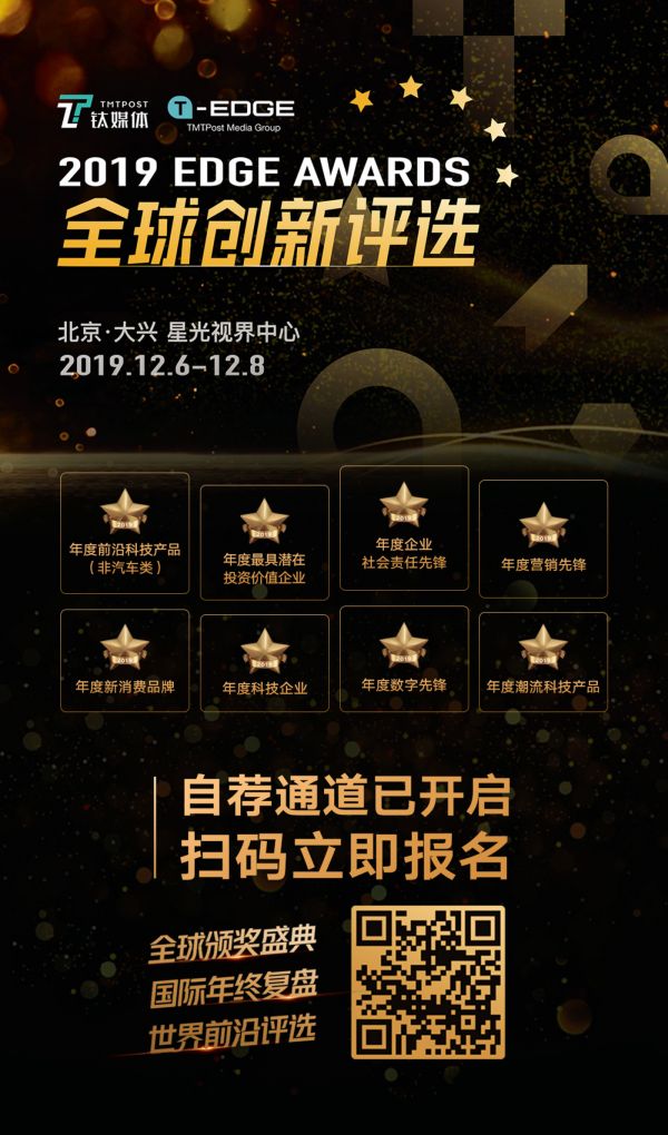 与此同时,钛媒体 EDGE Awards 全球创新评选正处于提名阶段,您可以在陆续发布的参评名单中为您看好的年度企业或者产品/项目投出宝贵的一票。同时向您发出诚挚邀请,于2019年12月8日晚来到钛媒体T-EDGE全球创新颁奖盛典的现场,与钛媒体共同见证荣耀奖项的诞生。