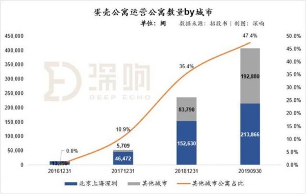 截至2019年9月30日,蛋壳公寓已进入北京、深圳、上海、杭州、天津、武汉、南京、广州、成都、苏州、无锡、西安、重庆13地市场,与成立的第一年(截至2015年12月31日,其运营的房间数为2,434间,且全部位于北京)相比,房间数增长了166倍,2015年底至2018年底三年年复合增长率高达360%。