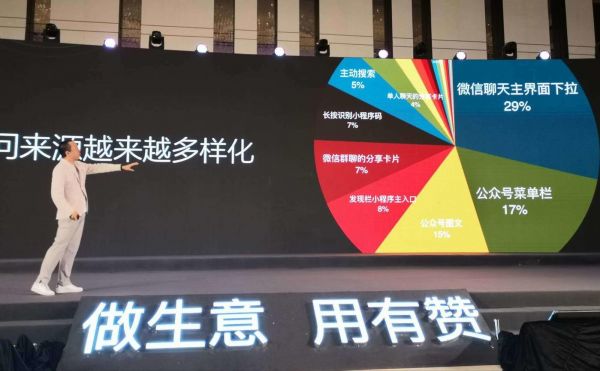 有赞官方数据显示:2018年小程序来自微信聊天主界面下拉菜单栏的流量占比已达29%,成为小程序一大核心流量入口。另外,小程序来自公众号菜单栏、公众号图文的流量占比分别达17%、15%。