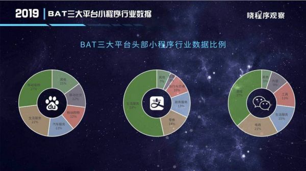当前BAT三家的小程序生态各有侧重的领域:微信的小程序生态侧重游戏与电商,支付宝小程序中生活服务占比最高;百度小程序分发的内容则以移动视频和生活服务为主。