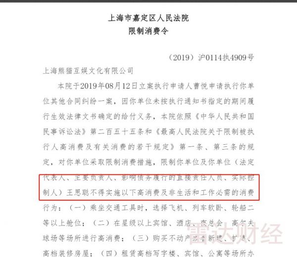 限制消费令指出,因熊猫互娱未按执行通知书指定的期间履行生效法律文书确定的给付义务,被采取限制消费措施,限制其法定代表人、主要负责人、影响债务履行的直接责任人员、实际控制人王思聪不得实施高消费及非生活和工作必需的消费行为。该限制消费令的颁布日期为2019年10月12日。