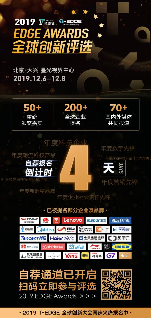 世界创新精英的年度盛宴来袭,探寻创新发展新思路,拥抱企业未来新征程, 2019 钛媒体T-EDGE全球创新大赛已进入火热报名期,总决赛将于12月7日北京大兴 星光视界中心,唱响科技创新的年度华章。