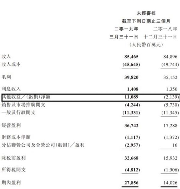 其中,腾讯2019年第一季度营收854.7亿元,同比增长16%,环比增长1%;净利润272.1亿元人民币,同比增长17%,环比增长91%。嗯,不用怀疑,这个季度,腾讯的投资收益应该是重返“正值”了。