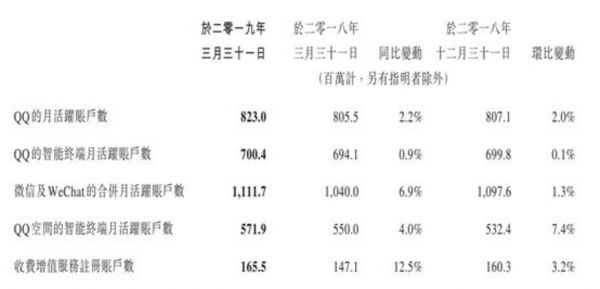 财报显示,这个季度,QQ的月活跃用户环比增长超过了微信:2019年3月31日QQ的月活跃用户达到8.23亿,较去年12月31日的8.07亿增长1600万,增速2%;而2019年3月31日微信及WeChat合并的月活跃用户为11.117亿,较去年12月31日的10.976亿增长1410万,增速1.3%。
