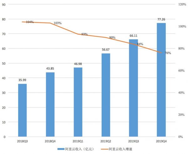 从横向比较看,云计算业务的增速也开始收缩,继上个季度出现以8为开头的增速后,本季度首次出现了以7开头的增速。增速相较去年同期的103%有明显下滑。