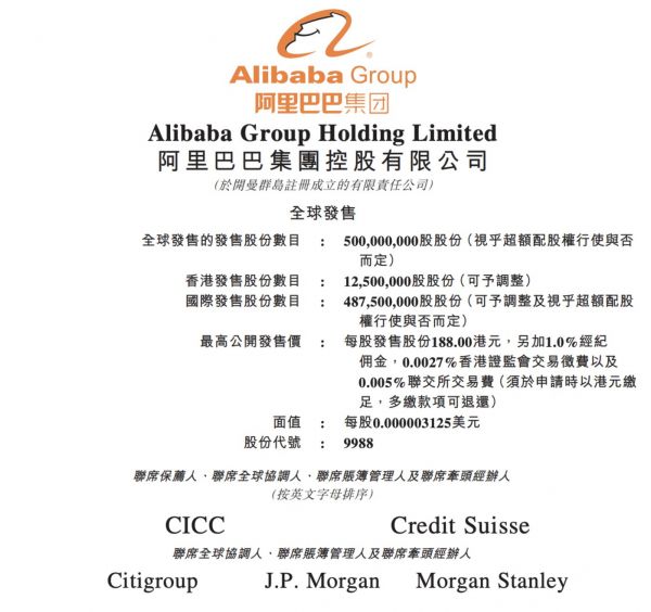 网址: 阿里巴巴将在11月26日赴港上市,每股不超过188港元 | 钛快讯 http://www.xishuta.cn/zhidaoview4394.html