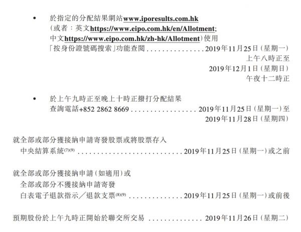 该公告提到,公司于11月15日至11月20日招股,公司拟发行5亿股,其中香港发售股份数目1250万股,国际发售股份数目4.875亿股,公开发售价将不超过每股香港发售股份188.00港元。将以每手100股股份进行买卖。预期股份将于2019年11月26日(星期二)上午9时正开始买卖。