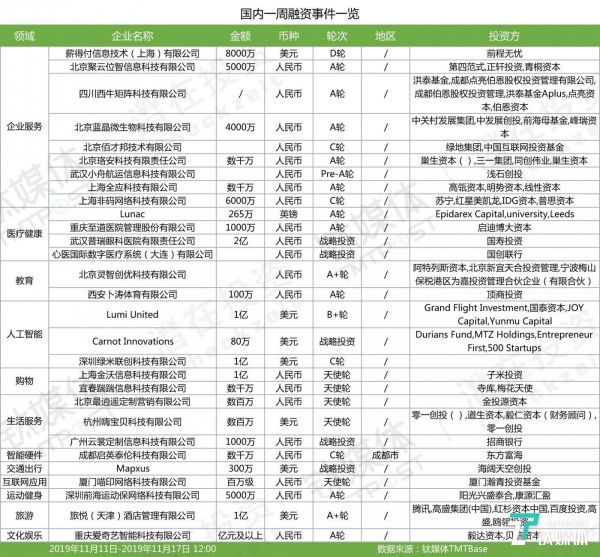 ✔. 本周钛媒体Pro全球创投数据库TMTBase总计收录国内投融资事件有29起。