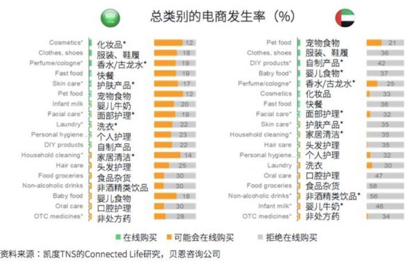 第三,更多的品类和SKU。一方面,虽然很多平台在中东都做全品类,但是从销量看各有侧重,比如SOUQ的3C,中国电商的服装、箱包等。目前中东的线上购买率非常低。从下图Facebook 《中东跨境电商市场白皮书》中,可以看出有很多产品(如化妆品、护肤品、家居清洁、婴儿食物、宠物食物等),用户线上购买意愿强,但普及率还不够高。