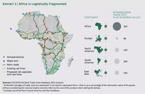 2.物流基础设施差。从上图能够看出,在非洲,商品的物流和配送成本大约是商品本身价值的320%,而这个数据在东亚和南美都只有140%。
