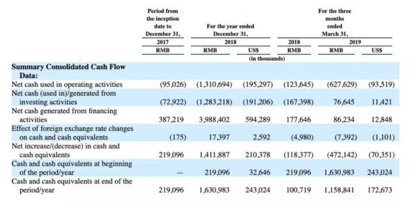 瑞幸咖啡目前尚不具备造血能力,经营活动所产生的现金流持续为负。在瑞幸咖啡的现金及等价物中,该公司仍是通过融资活动获取现金流——自2017年至2019年第一季度,通过融资形式共获得的资金约为44.61亿元。