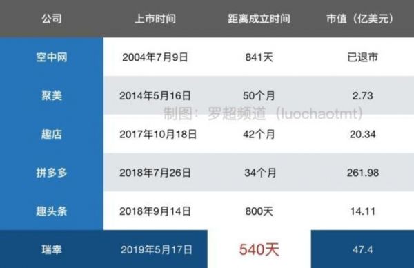 瑞幸咖啡还打破了此前趣头条保持的成立到上市的最快时间记录,罗超频道统计发现,瑞幸咖啡从成立到上市只用了18个月。540天,放眼在全世界范围的所有行业来看,瑞幸咖啡也是从成立到上市用时最短的公司。因此,瑞幸咖啡IPO被媒体称为“光速”上市。