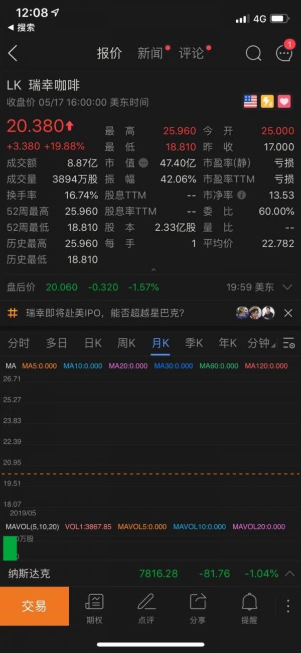 从招股价来看,应该说凡是参与这次瑞幸新股认购的投资者,都获得了非常高的回报,但是从当天第一天交易的客户来讲,因为它整体是呈现一个高开低走的局面,我会认为,整体来讲还是美股抽新股的盈利会比较好。”