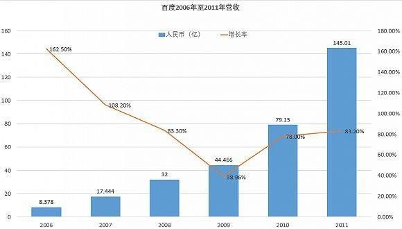 2011年3月24日,百度首次超过腾讯,成为中国市值最高的互联网公司。以当天的收盘价计算,百度的市值达到445亿美元,相比于2005年IPO时的8.7亿美元,增长了83倍。