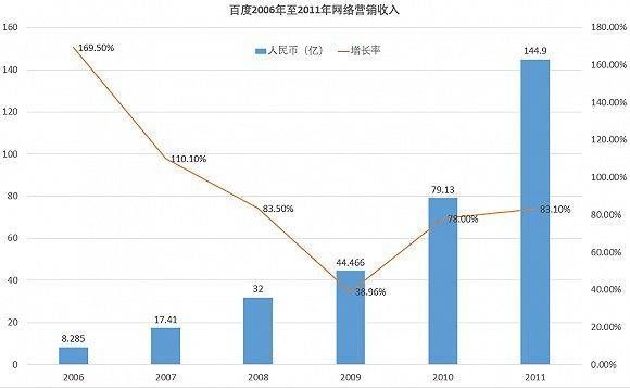 与向海龙步步高升保持同一步调,百度的营收和市值也水涨船高。2006年~2011年这五年间,百度的总营收从8亿美元快速攀升至145亿美元,增长了17倍,其中最主要的贡献者来自网络广告业务。