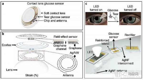 谷歌与诺华合作,也分别在各自擅长的电子微型化和应用医疗技术方面取得了显著的进步,开发出用于泪液葡萄糖监测的接触式隐形眼镜平台。这个这个软性隐形眼镜平台概念产品包含了无线控制芯片、缩微电化学转换器以及天线,并嵌入了水凝胶骨架,用于对周围的眼泪进行葡萄糖无创检测。