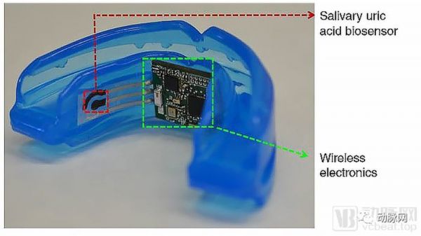 该团队进一步展示了护齿形态的尿酸生物传感器,可对唾液中的尿酸水平进行监控,从而可以间接实现对血液尿酸的无创监测。血液尿酸是多种疾病(如高尿酸血症、痛风和肾综合征)的生物标志物。