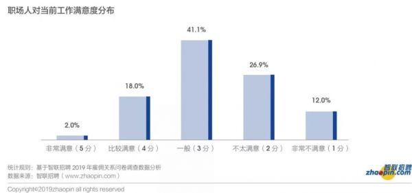 智联招聘发布的《2019年雇佣关系趋势调研报告》显示,在对工作满意度的调查中,整体满意度仅有2.71分,不及一般(3分)水平,其中选择一般的占比41.1%,不满意的整体占比38.9%。