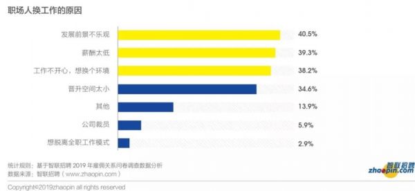 而在换工作的原因分布中,因发展前景不乐观、薪酬太低、工作不开心等原因离职的占比较高,总结起来就是“没前(钱)途”和“不开心”。