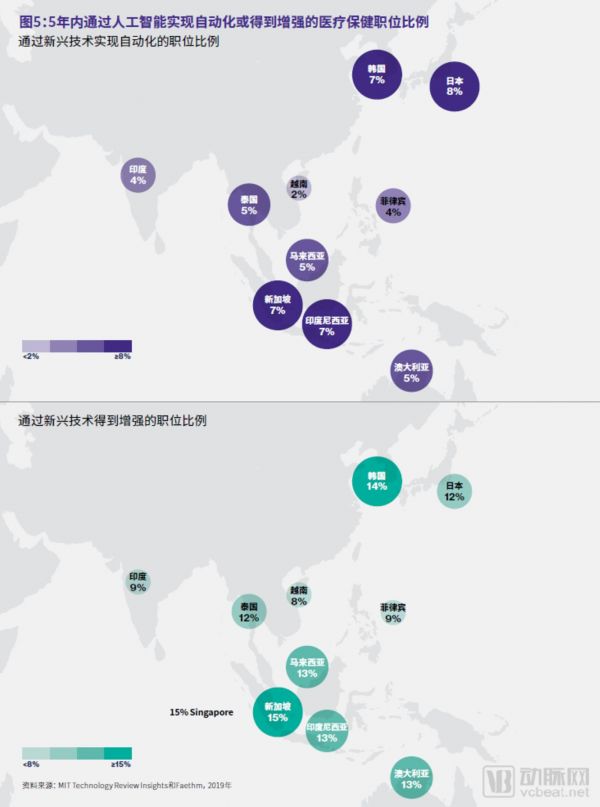 与正在迅速部署新兴技术的大多数行业一样,人们对人工智能在取代现有或未来医疗保健工作方面所具备的可能性也进行了许多讨论。MIT Technology Review Insights在《人工智能与人力资本》中估计,在11个亚太市场,医疗保健将成为人工智能和自动化技术的受益行业之一。虽然该行业的工作机会将减少,从日本的约8%到菲律宾的约5%不等,但更大的影响在于,随着新兴技术的出现,这些工作将得到增强和改善。研究表明,在新加坡和韩国等市场,大约14%的医疗保健工作将因为人工智能而变得更加高效和更具生产力。