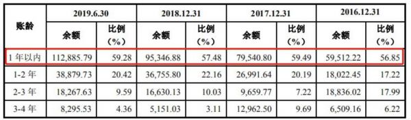 具体而言,2016年末、2017年末、2018年末和2019年6月末,德才装饰一年以内的应收账款分别占应收账款余额的56.85%、59.49%、57.48%和 59.28%,而同行同期的平均值为 64.46%、64.21%、63.57% 和67.81% ,德才装饰低于同行近10个百分点。