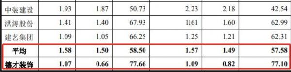 招股书显示,2016年到2019年上半年,行业可比上市公司资产负债率平均值为57.58%、58.5%、62.48%和63.07%,而德才装饰的资产负债率分别为77.10%、77.66%、77.98%和76.66%,常年接近于80%,远远高于同行业水平。