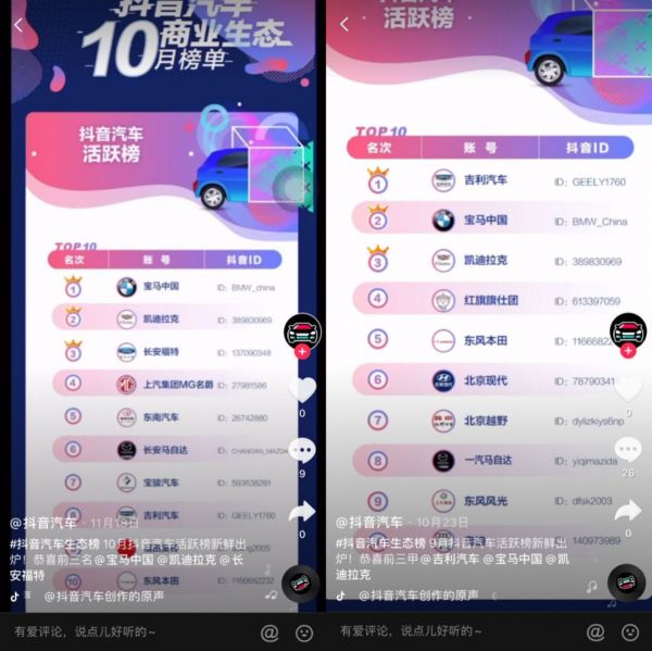 汽车品牌主的蓝V账号也在紧跟。目前,抖音上的汽车品牌企业号有41个,抖音官方每月发布的榜单上,@宝马中国、@凯迪拉克、@吉利汽车、@东风本田等账号都是排名前十的常客。抖音蓝V正在成为企业营销的新标配。