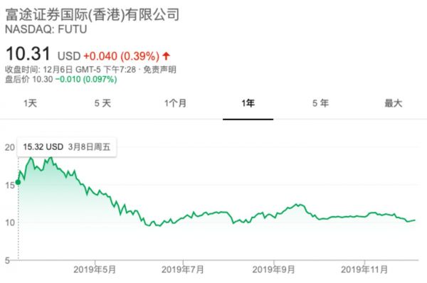 发行价:12美元开盘价:14.76美元美东时间12月6日收盘价:10.31美元作为互联网券商海外上市第一股,有着腾讯投资背景的富途控股在上市时得到资本市场热捧。美东时间3月8日,富途控股(代号:FHL,10月17日改为FUTU)登陆纳斯达克交易所,发行价为12美元,是发行价区间10-12美元的最高值,开盘报14.76美元,较发行价大涨23%。盘中股价一度冲至17.5美元,收盘报15.32美元。