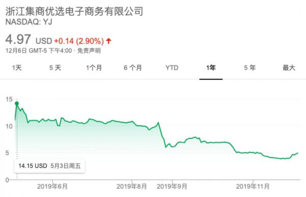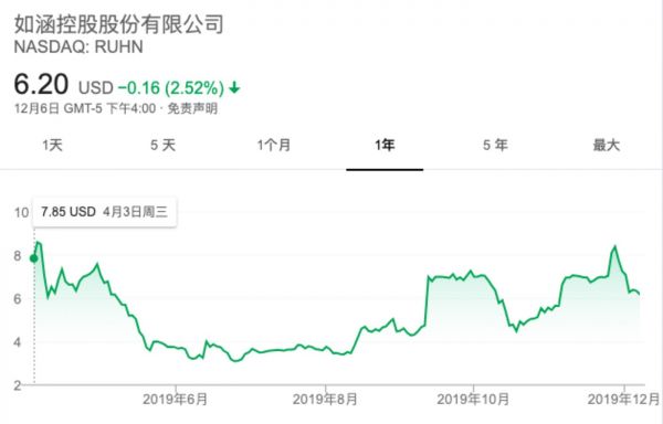 发行价:12.5美元开盘价:11.5美元美东时间12月6日收盘价:6.2美元4月3日,“网红电商第一股”如涵控股在纳斯达克挂牌上市,发行价为12.5美元。与当时在社交媒体上的热度形成对比的是,如涵控股开盘破发,报11.5美元,收盘较发行价大跌37.2%,报7.85美元。上市后如涵控股股价持续走低,最低时曾下探至3美元。
