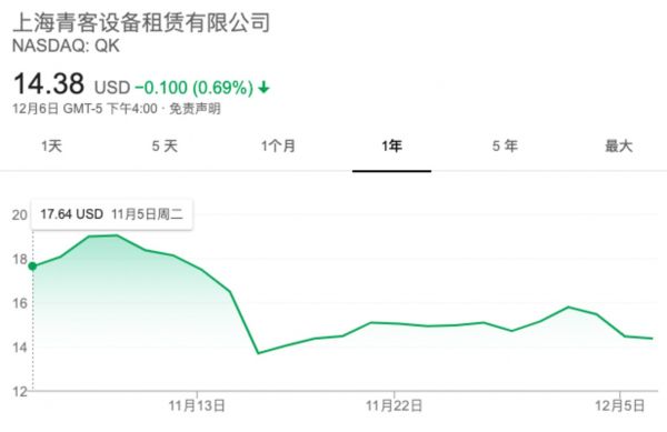 发行价:17美元开盘价:17.35美元美东时间12月6日收盘价:14.38美元11月5日,“长租公寓第一股”青客公寓在纳斯达克挂牌上市,发行价为17美元,开盘报17.35美元,收盘报17.64美元,涨幅3.76%。11月14日,青客公寓的股价跌至发行价以下,收盘报16.5美元,此后一直处于破发状态。