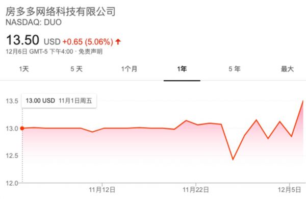 发行价:13美元开盘价:13美元美东时间12月6日收盘价:13.5美元11月1日,房多多在美国纳斯达克交易所上市,成为“中国产业互联网SaaS第一股”。上市首日开盘价、收盘价与发行价持平,均为13美元。上市至今一个月,12月6日收盘价为13.5美元,略高于发行价。