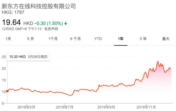 发行价:10.2港元开盘价:10.2港元12月6日收盘价:19.94港元3月28日,在经历了独立拆分,新三板挂牌、摘牌后,背靠新东方集团的新东方在线在香港联交所主板挂牌,成为港股在线教育第一股。上市首日,新东方在线开盘报价为10.2港元,与发行价定价一致,最终收盘价亦与发行价持平。自9月9日被纳入港股通后,新东方在线获南下资金不断增持,股价持续飘红。