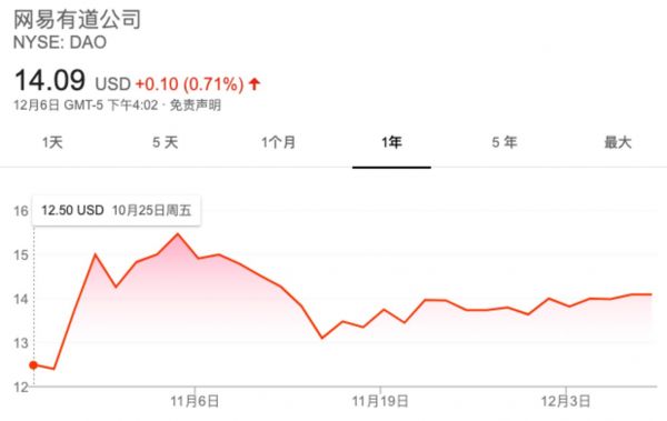 之后,有道股价迎来上涨,11月5日收盘价为15美元。11月21日,有道公布上市后首份财报,在第三季度有道实现净收入3.459亿元,同比增长98.4%;亏损2.42亿元,同比扩大214%。财报发布后,有道股价稳中略升。