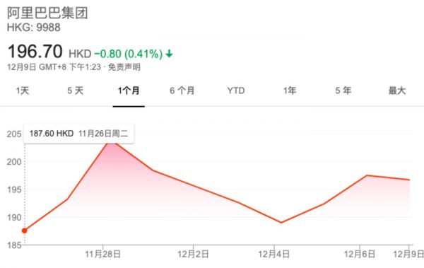 上市后二级市场对阿里巴巴的热情持续高涨,股价一度被推高至200港元以上。高盛在12月5日发布研报,初次覆盖港股上市的阿里巴巴,给出“买入”评级并纳入确信买入名单,其对阿里巴巴港股的12个月目标价为每股252港元。评级发布后,阿里巴巴股价走高。12月5日,阿里巴巴港股收涨1.8%,报192.4港元;12月6日,阿里巴巴港股收涨2.65%,报197.5港元。