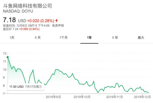 发行价:11.5美元开盘价:11.02美元美东时间12月6日收盘价:7.18美元7月17日,游戏直播平台斗鱼在纳斯达克挂牌,开盘破发,股价报11.02美元,较发行价11.5美元跌逾4%,尾盘拉升最终收平,此后股价一路下跌。